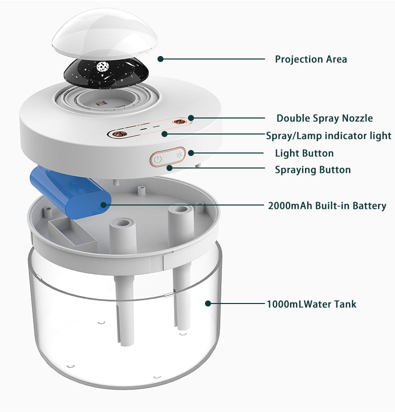2. Projection button: Press the first color change mode (white, blue, and yellow), press the second white light, the third blue light, the fourth yellow light, and the fifth turn off the light. Long press to turn on the lamp rotation function, long press again to turn off the rotation function.